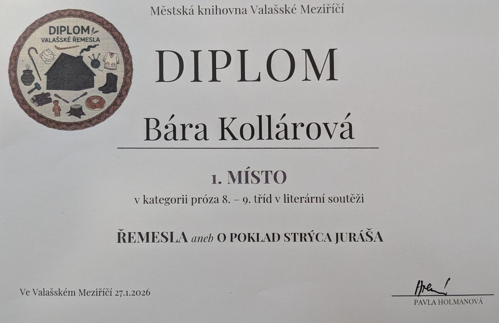 Svým originálním prozaickým textem na téma Valašsko v řemeslech zaujala porotu natolik, že si ve své kategorii vybojovala 1. místo.