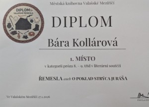 Žákyně naší školy Bára Kollárová z 9. A dosáhla krásného úspěchu v literární soutěži O poklad strýca Juráša, kterou každoročně vyhlašuje Městská knihovna Valašské Meziříčí.